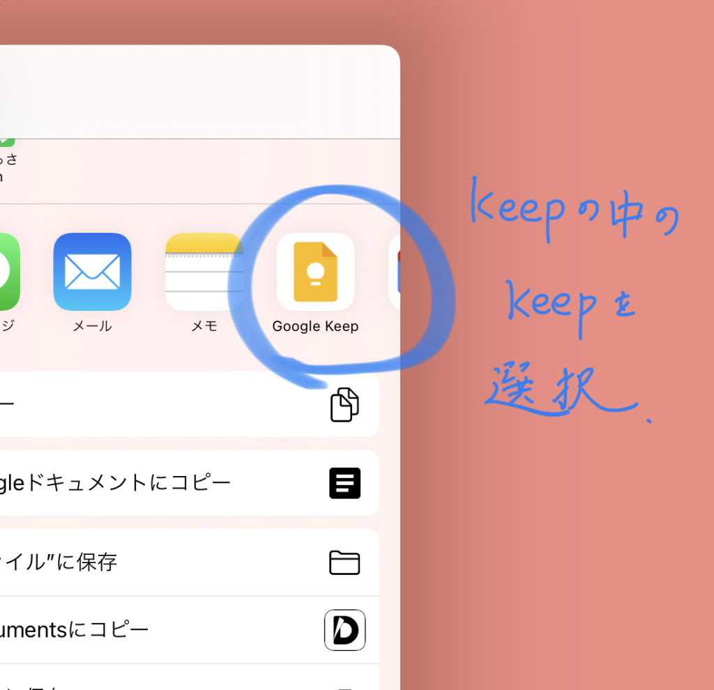 その他のアプリに「Keepメモ」が選択肢として出てくる